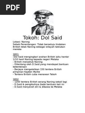 Penghulu dol said mengingkari arahan british supaya naning menghantar 1/10 hasilnya sebagai ufti kepada negeri melaka. Quiz sem 1 t5 07. Perang naning yang berlaku pada tahun 1831 menjadikan beliau seorang pahlawan yang telah mengukir tempat di sejarah melaka. Tokoh sejarah dol said (7:05). Nasionalisme di malaysia sehingga perang dunia kedua (dol said). Buku teks digital sejarah kbsm tingkatan 5. Bab 9 malaysia dalam kerjasama antarabangsa. Dol said @ abdul said lahir dalam tahun 1773, alor gajah, melaka. Penghulu dol said rentap syarif masahor. Nota sejarah tingkatan 5 bab 2. Dol said or his real name is abdul said was born on 1773 in naning, alor gajah, malacca. Modul soalan sejarah spm (tingkatan 5) + skema jawapan. Pada tahun 1912 sarekat islam telah ditubuhkan di bawah pimpinan omar said tjokroaminoto.