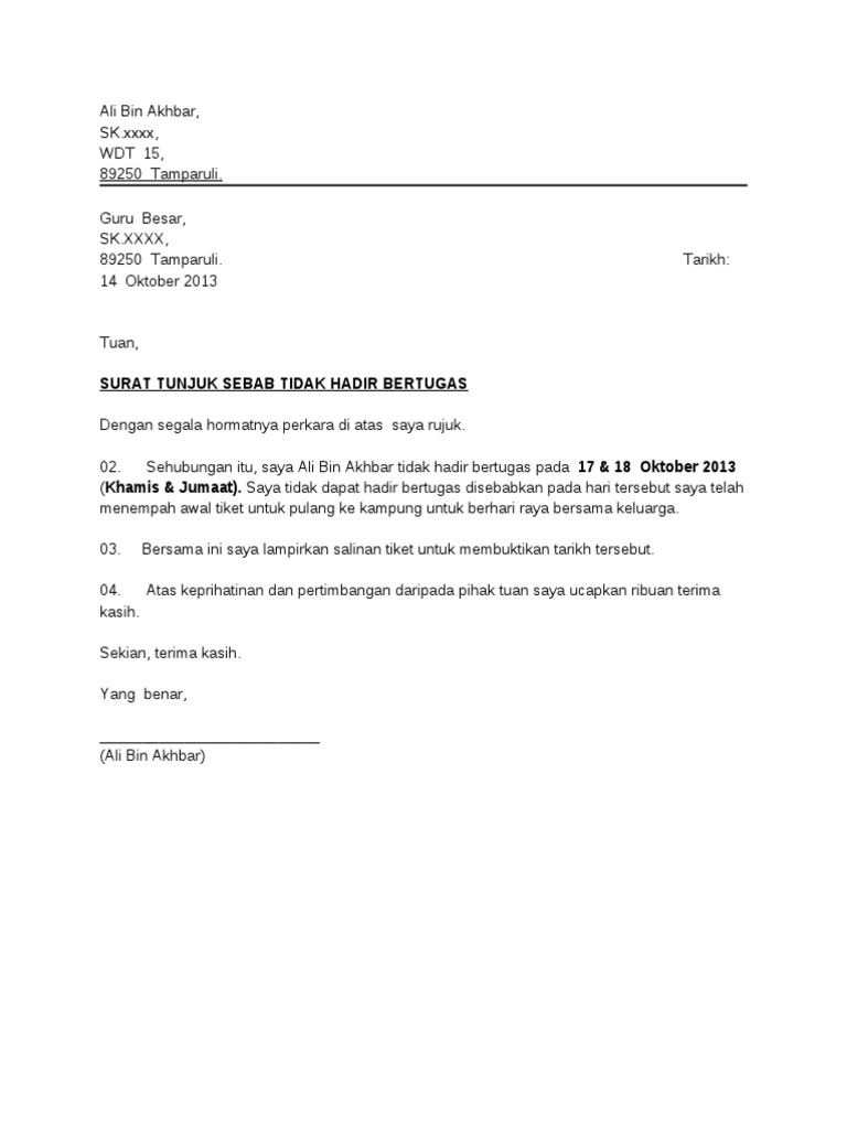 Dengan itu, saya sudahi dengan ucapan mohon maaf di atas ketidakhadiran untuk bertugas dan amat mengharapkan kerjasama pihak tuan ,ini adalah kali pertama saya menulis surat tunjuk sebab diatas insiden yang. Contoh surat rasmi tidak hadir ke sekolah kerana balik via ndangkerjo.blogspot.com. Contoh surat rasmi tidak hadir ke sekolah kerana demam. Di sini akan diberikan contoh surat tidak hadir ke sekolah yang ringkas untuk digunapakai. Surat tunjuk sebab ketidakhadiran kerjadengan hormatnya merujuk kepada perkara di atas. Usahakan kalian download sebagai review saja, belilah cd original atau kalian beli secara online seperti di itunes untuk mendukung semua artis agar terus berkarya. Sebelum itu, tersebar satu surat tunjuk sebab daripada lembaga disiplin umno terhadap hishammuddin yang didakwa melanggar perlembagaan parti itu dan tata etika sebagai ahli umno. Surat tunjuk sebab adalah surat yang amat penting untuk ditulis selain surat rayuan. Iii) surat tunjuk sebab tidak menghadiri kursus 2. Atas sebab dan kerisauan mengenai perkara sebegitu, pihak sekolah berhak untuk mendapatkan penjelasan tentang sebab ketidakhadiran pelajar ke sekolah yang telah ditandatangani sendiri contoh surat rasmi tidak hadir ke sekolah (sakit, demam, urusan keluarga dan sebagainya). Surat penjelasan tunjuk sebab ini sangat penting agar kita tidak dikenakan tindakan tata tertib. Contoh surat rasmi dan tidak rasmi contoh 36 via contoh36.blogspot.com. Sebab ketidakhadiran saya adalah kerana ibu saya masuk hospital temerloh5.